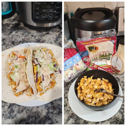 - 585 calorie dinner with 70g protein. Chicken tacos