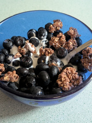 - Greek yogurt, blueberries and dark chocolate granola for some post weightlifting fuel