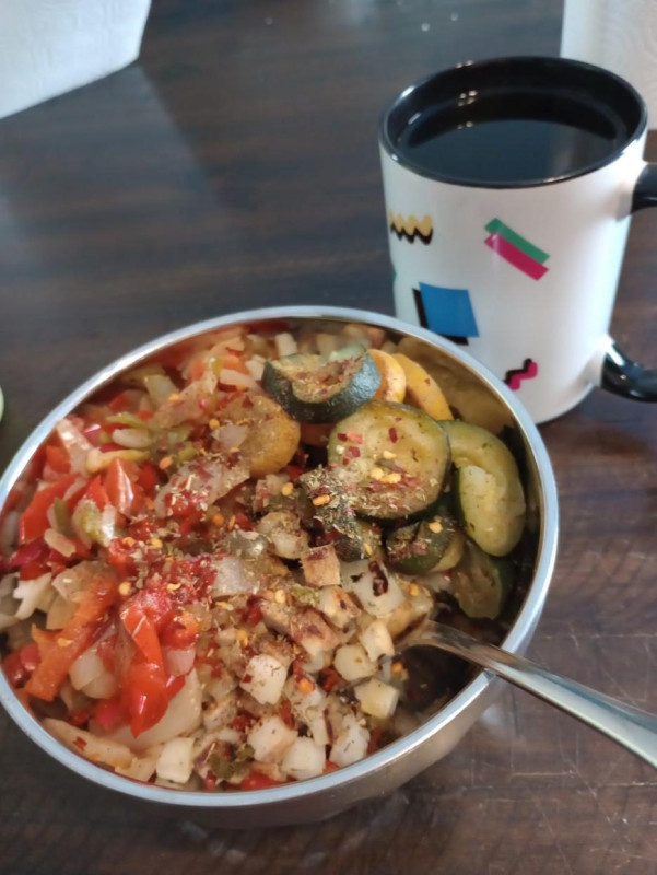 - Potato reset begins! Hashbrowns with peppers onions and zucchini, peppermint tea