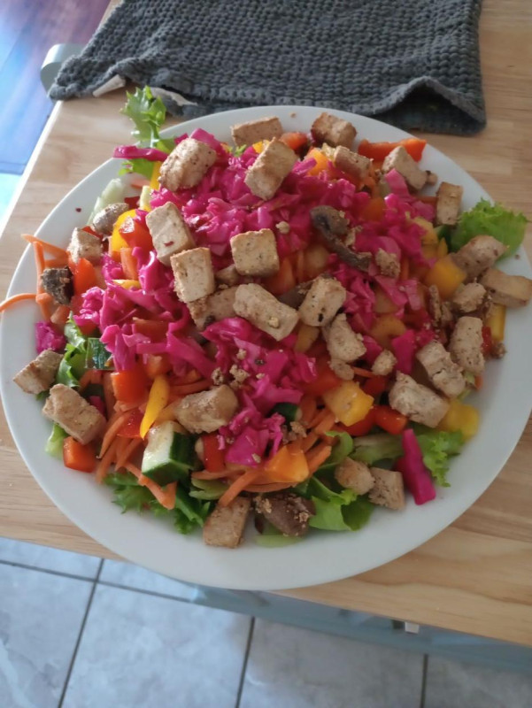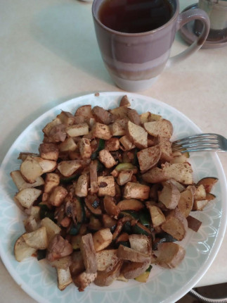 - Roasted zucchini, potato and tofu, hibiscus tea